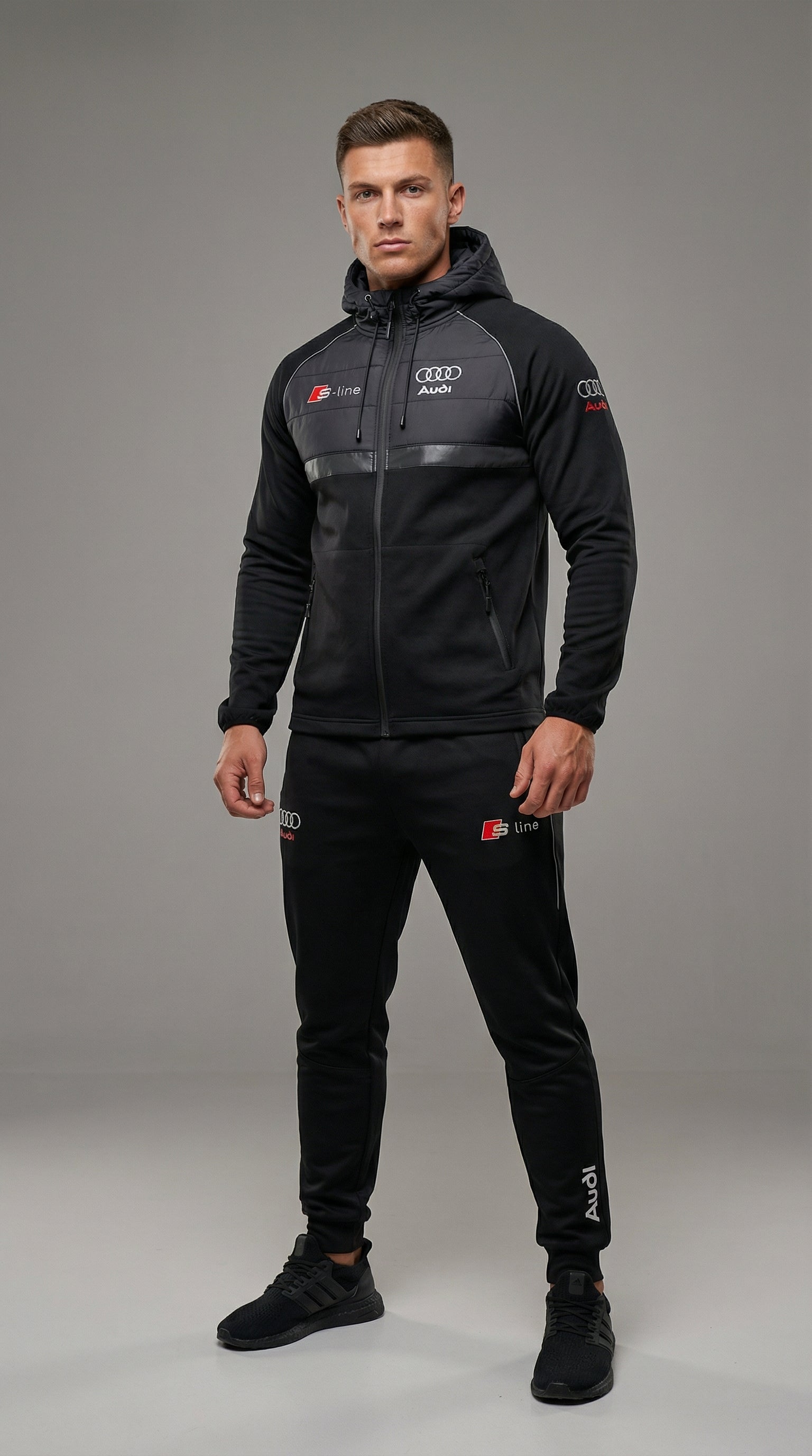AUDI S LINE QUATTRO ZWART GEWATTEERD TRAININGSPAK VAN TWEE MATERIALEN